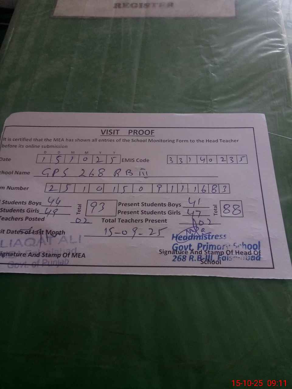 | Attendance Register | Head Teacher | MEA with School | Visit Proof |