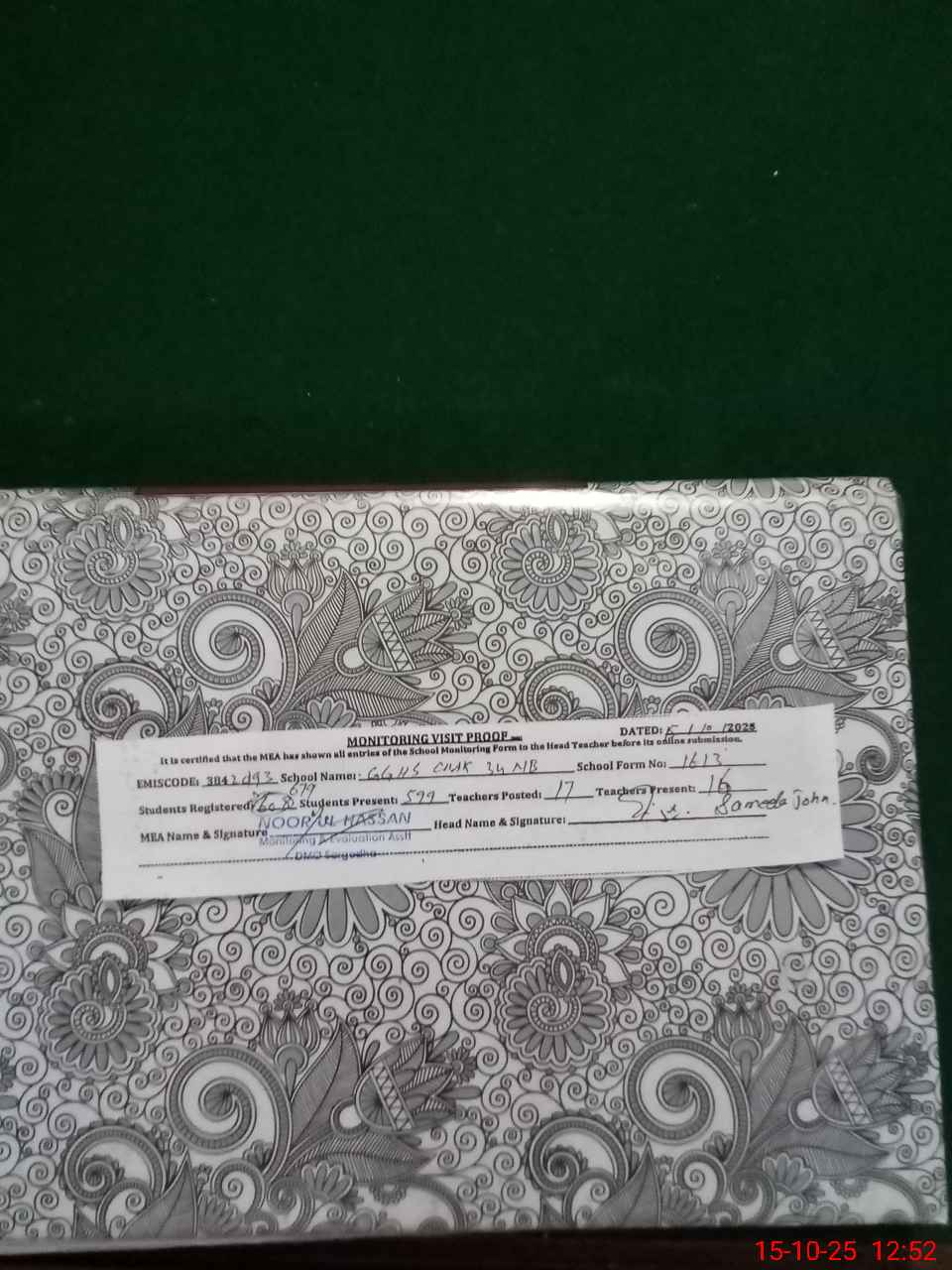 | Certified that this School was Inspected by the Undersigned MEA/DMO Today and the Information Stated Above is as Per Record. | |||||