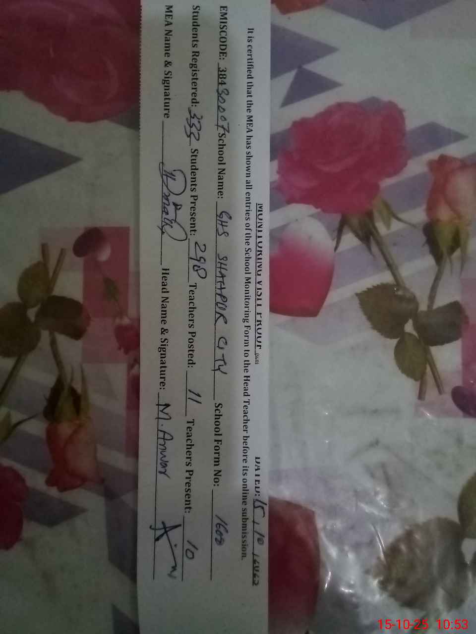 | Certified that this School was Inspected by the Undersigned MEA/DMO Today and the Information Stated Above is as Per Record. | |||||