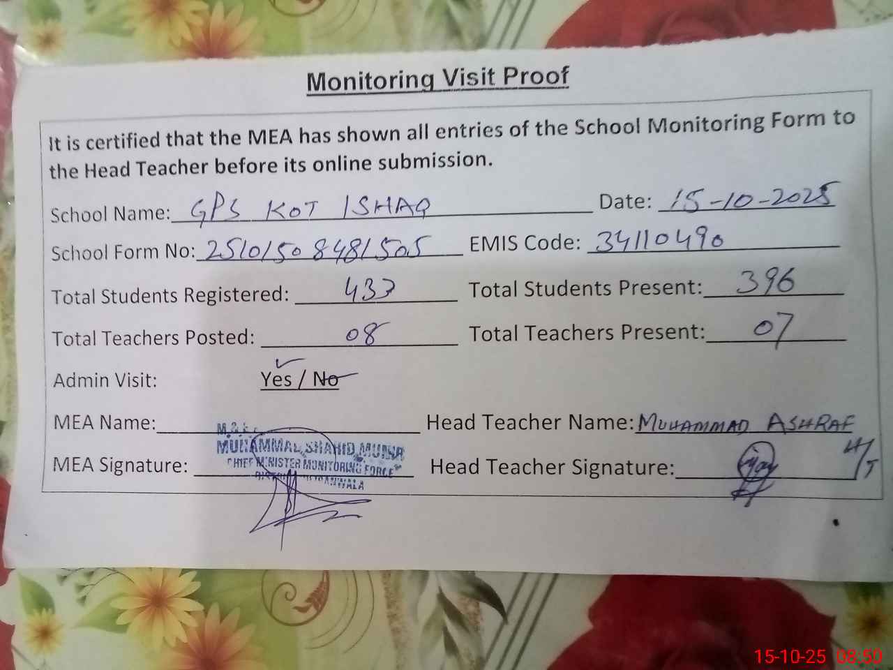 | EMIS Code: 34110490 | Name of School: GPS KOT ISHAQ | |||