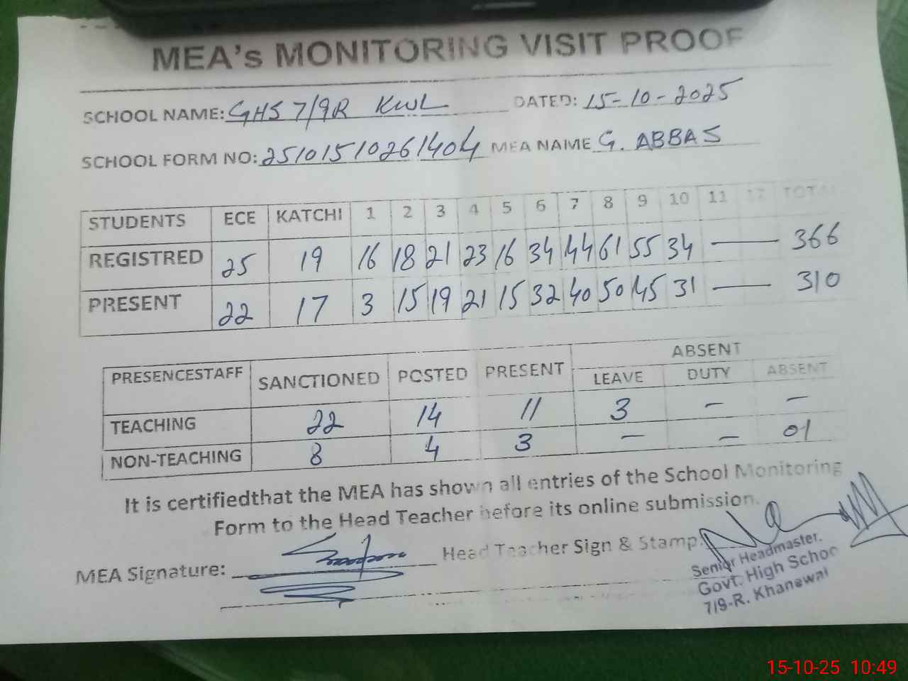 | Attendance Register | Head Teacher | MEA with School | Visit Proof |