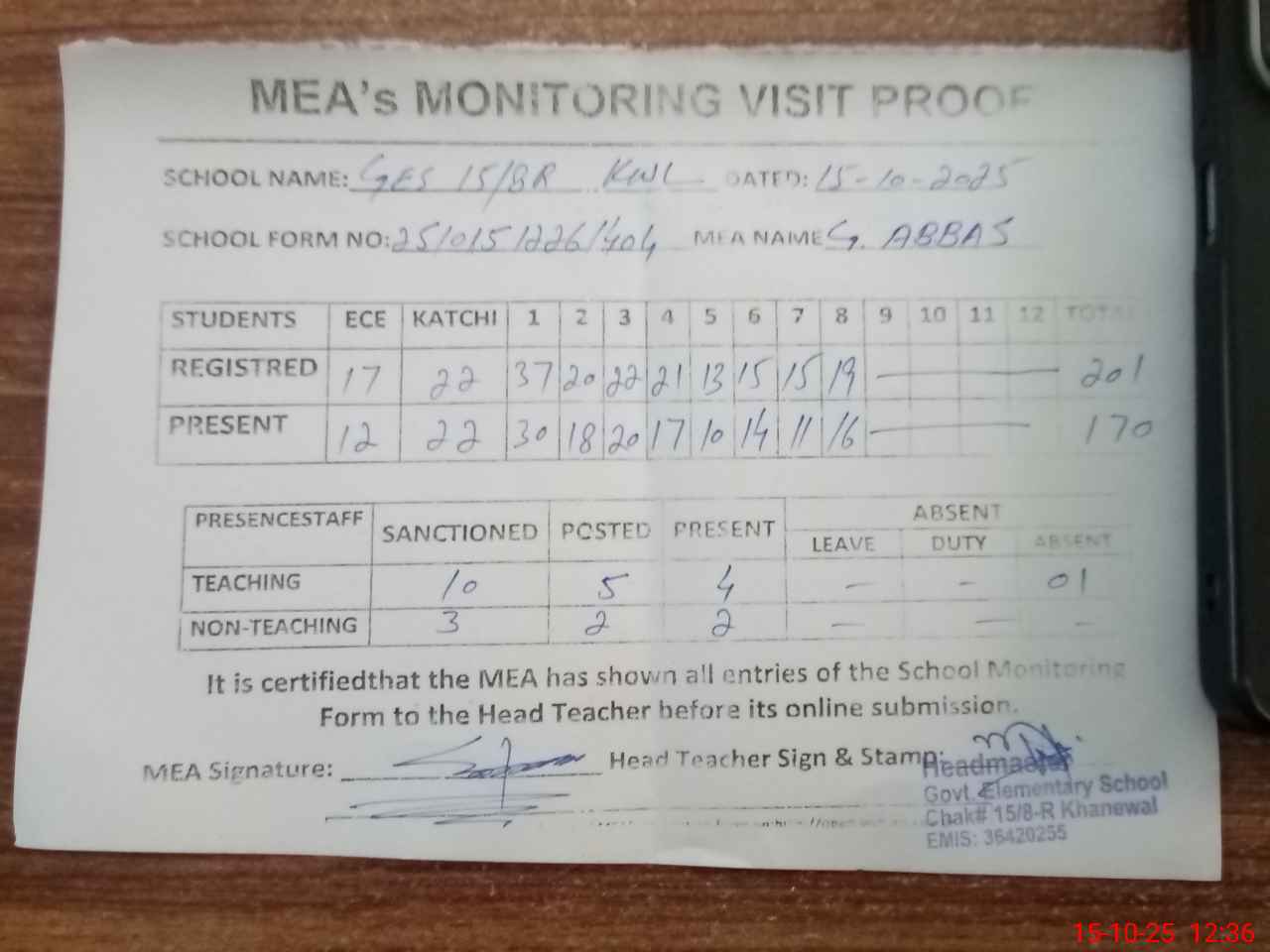 | Attendance Register | Head Teacher | MEA with School | Visit Proof |