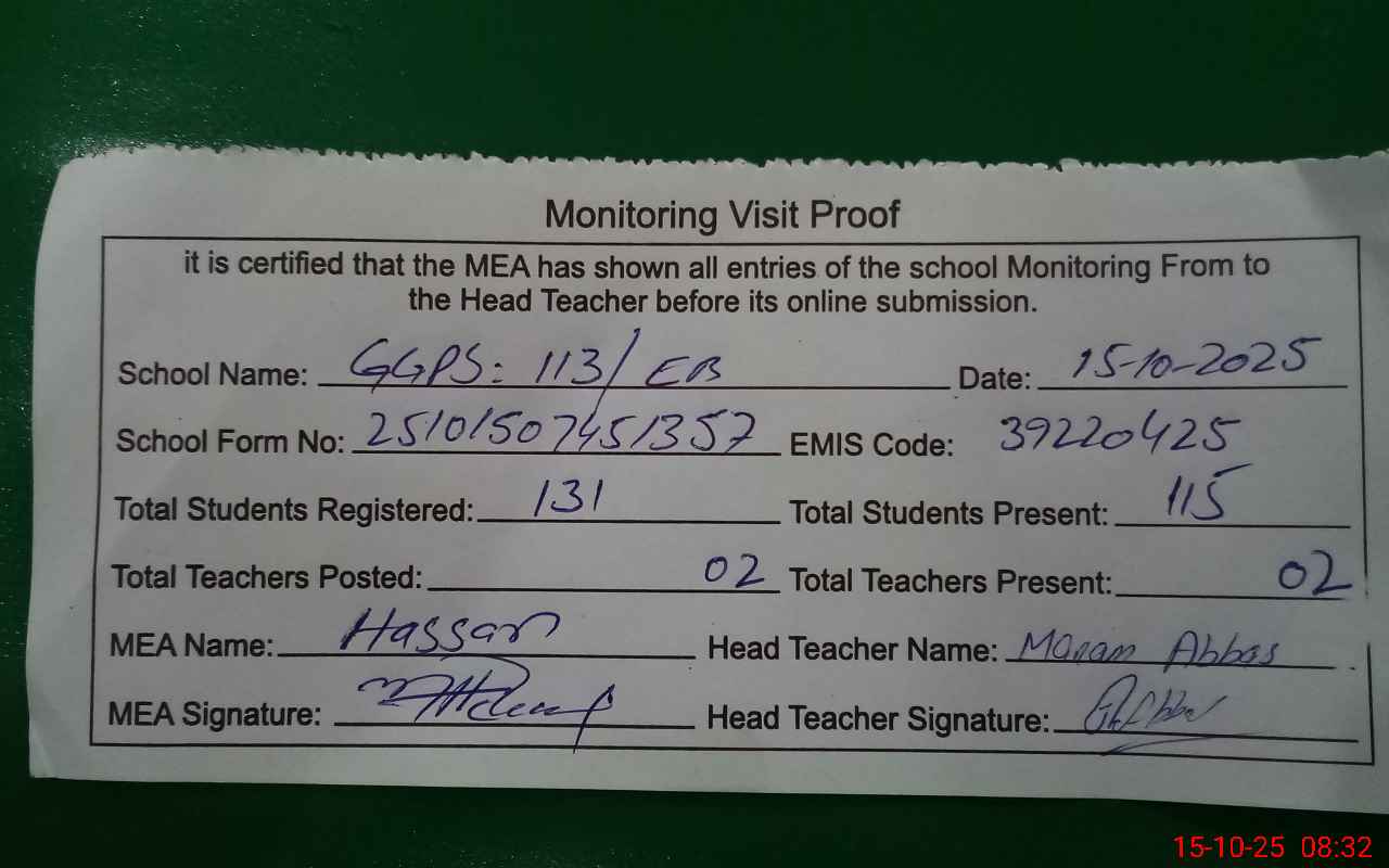 | EMIS Code: 39220425 | Name of School: GGPS 113 EB | |||