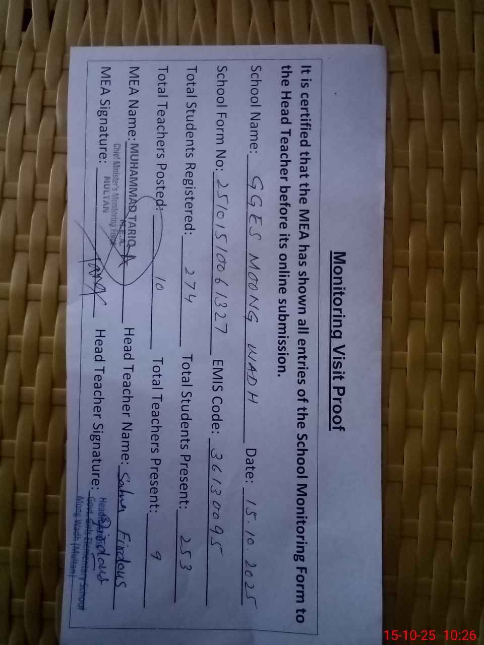 | Certified that this School was Inspected by the Undersigned MEA/DMO Today and the Information Stated Above is as Per Record. | |||||