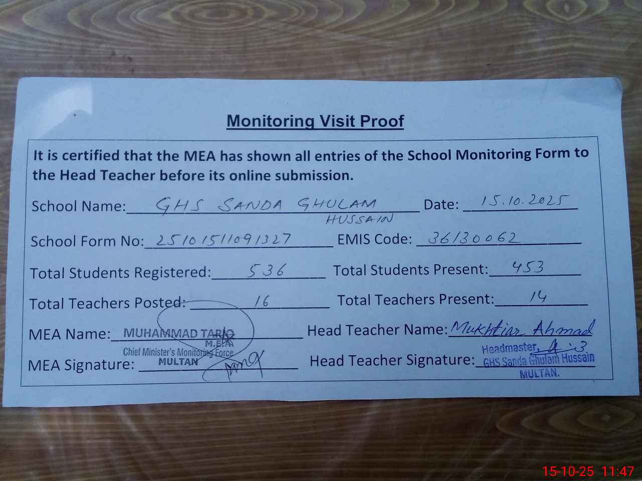 | Attendance Register | Head Teacher | MEA with School | Visit Proof |