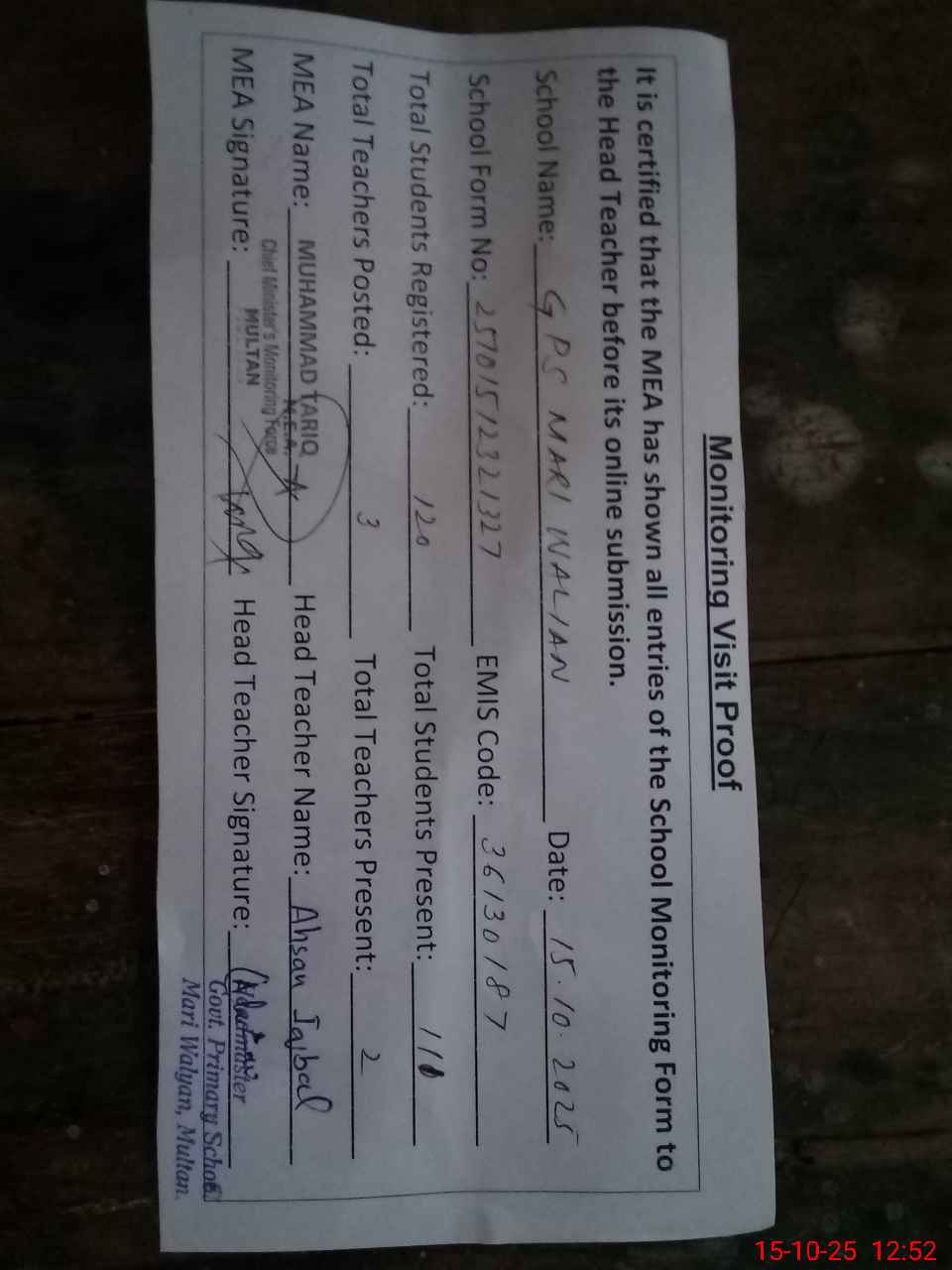 | Attendance Register | Head Teacher | MEA with School | Visit Proof |