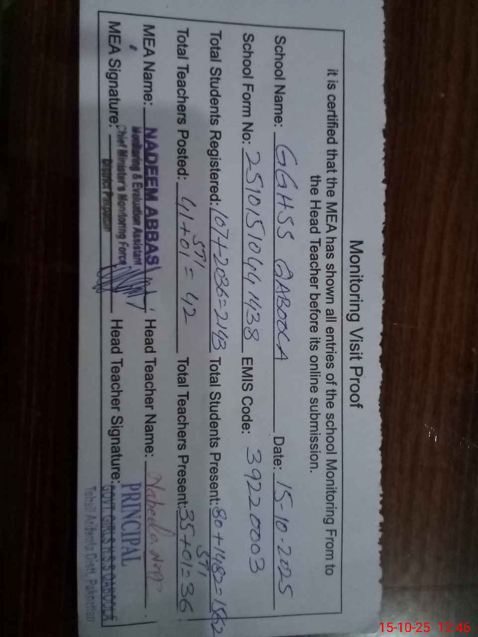 | EMIS Code: 39220003 | Name of School: GGHSS QABOOLA, ARIFWALA | |||