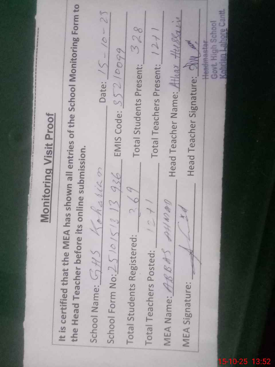 | Certified that this School was Inspected by the Undersigned MEA/DMO Today and the Information Stated Above is as Per Record. | |||||