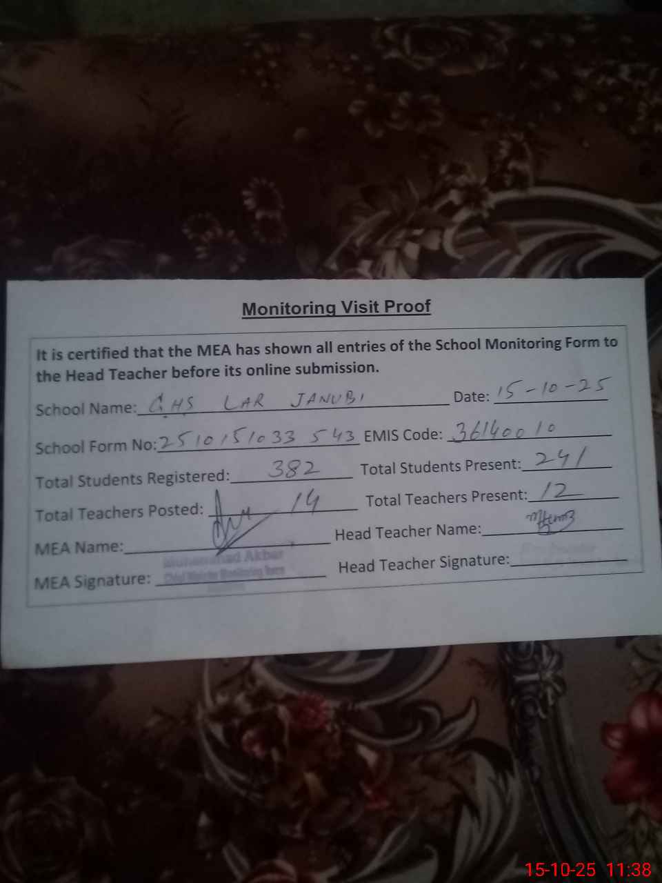 | Attendance Register | Head Teacher | MEA with School | Visit Proof |