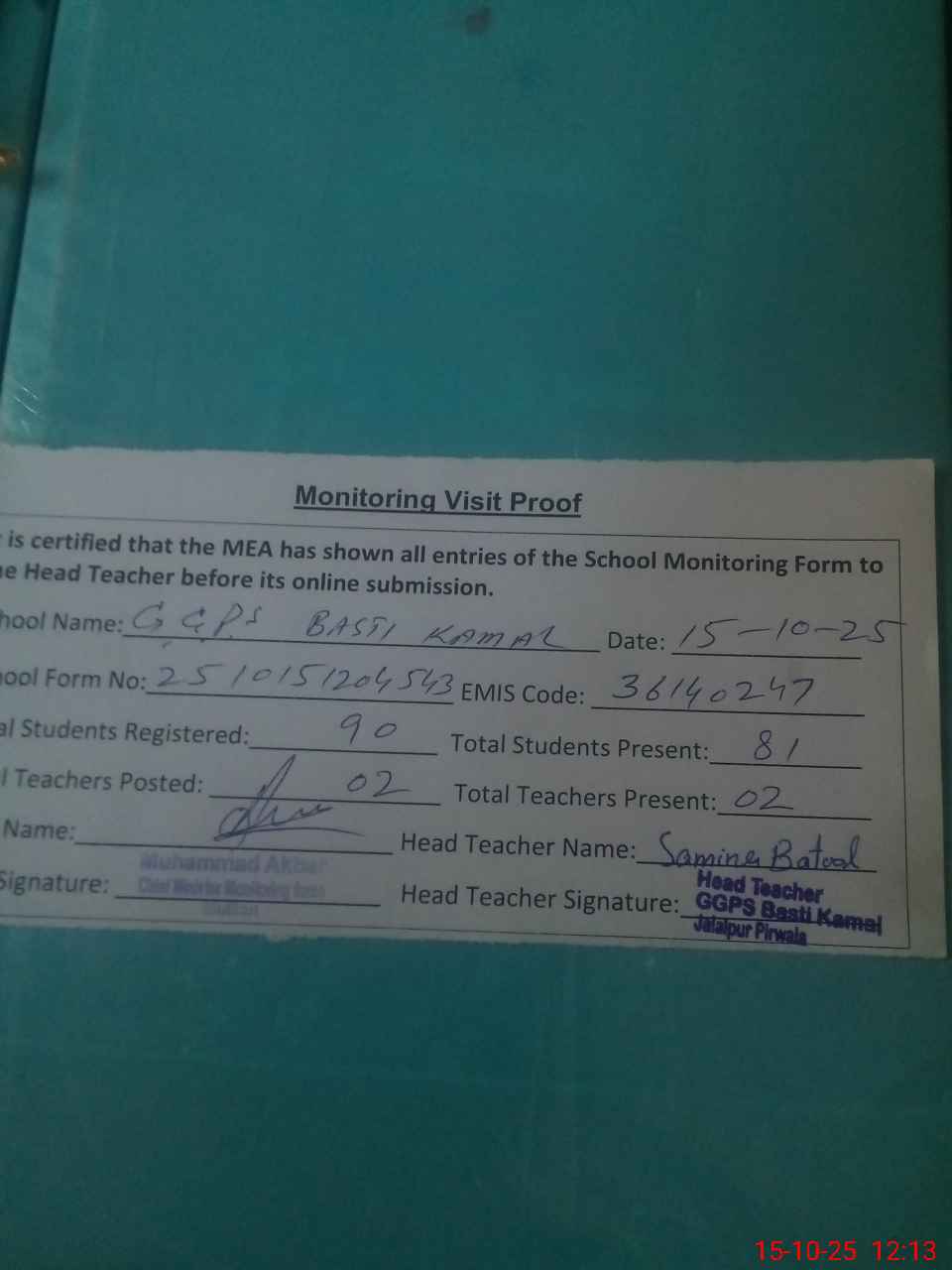| Attendance Register | Head Teacher | MEA with School | Visit Proof |