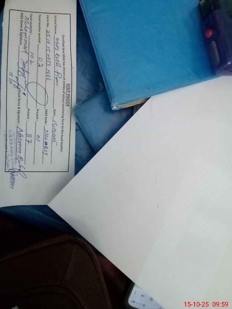 | Attendance Register | Head Teacher | MEA with School | Visit Proof |