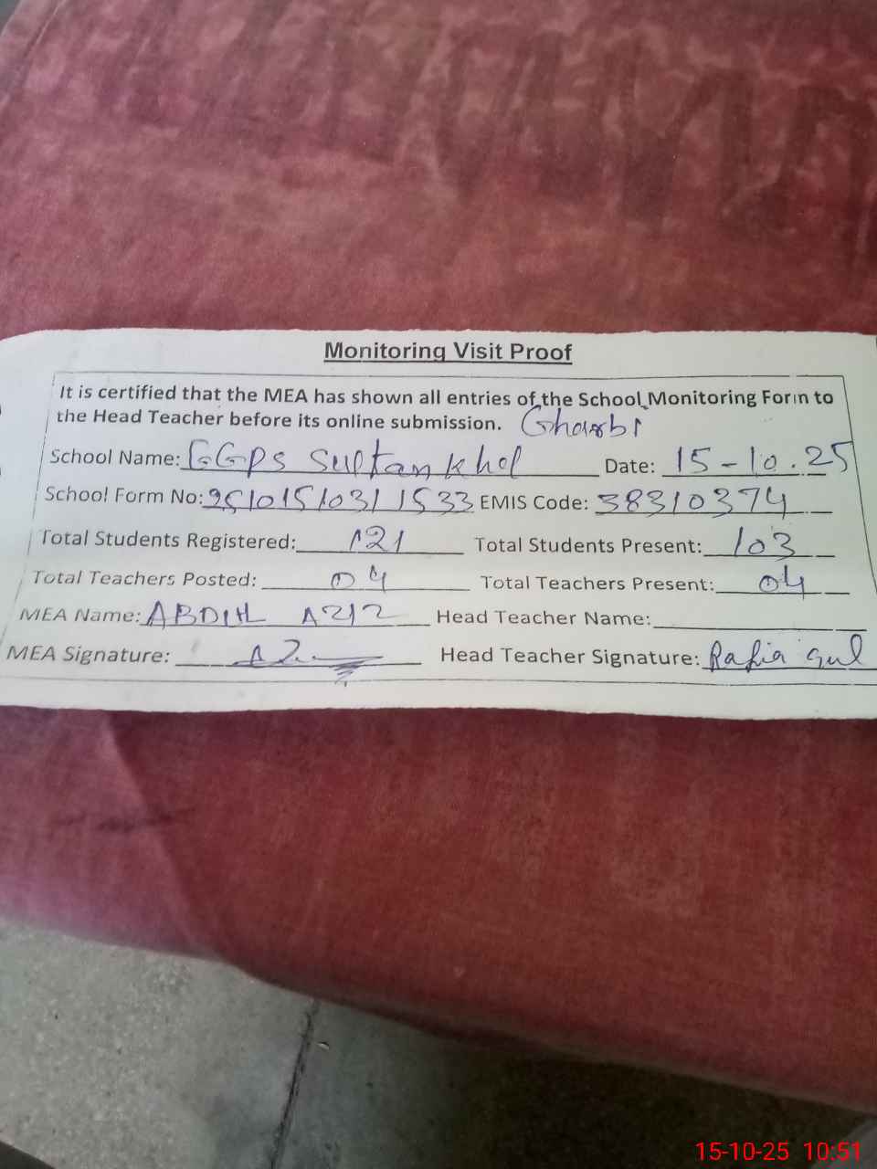 | Attendance Register | Head Teacher | MEA with School | Visit Proof |