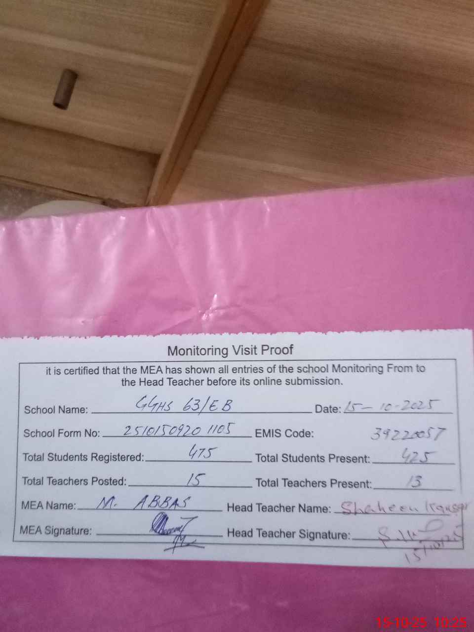 | Certified that this School was Inspected by the Undersigned MEA/DMO Today and the Information Stated Above is as Per Record. | |||||