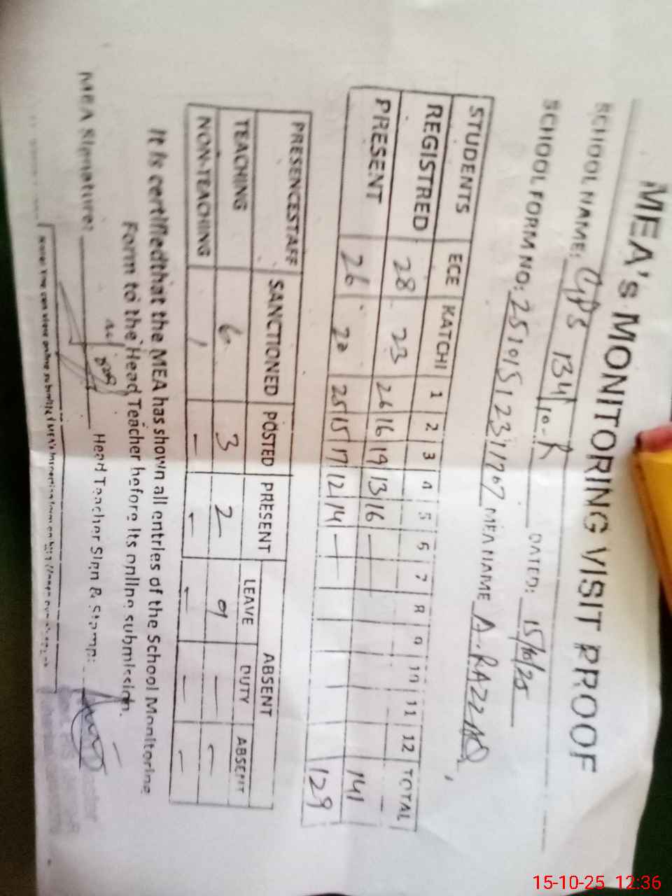 | Attendance Register | Head Teacher | MEA with School | Visit Proof |