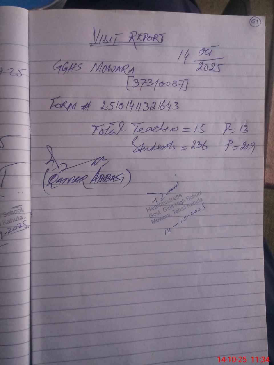 | Monitoring Date: 14-10-2025 | Start Time: 14-10-2025 11:00 AM | End Time: 14-10-2025 11:38 AM | Name of MEA: Qa**** Za**** | |