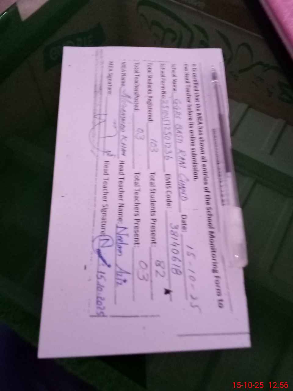 | Certified that this School was Inspected by the Undersigned MEA/DMO Today and the Information Stated Above is as Per Record. | |||||