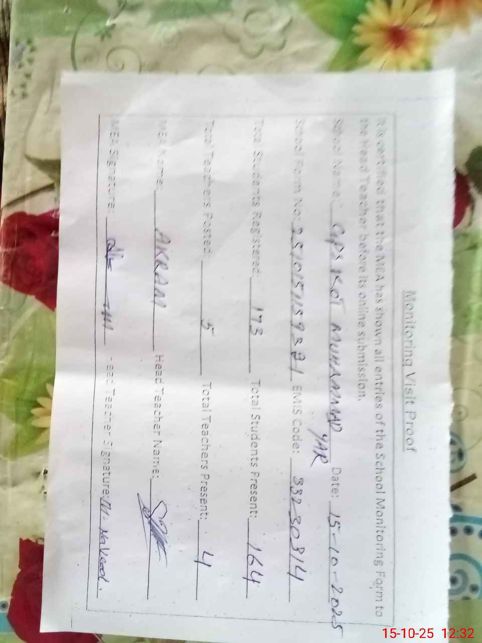| Certified that this School was Inspected by the Undersigned MEA/DMO Today and the Information Stated Above is as Per Record. | |||||