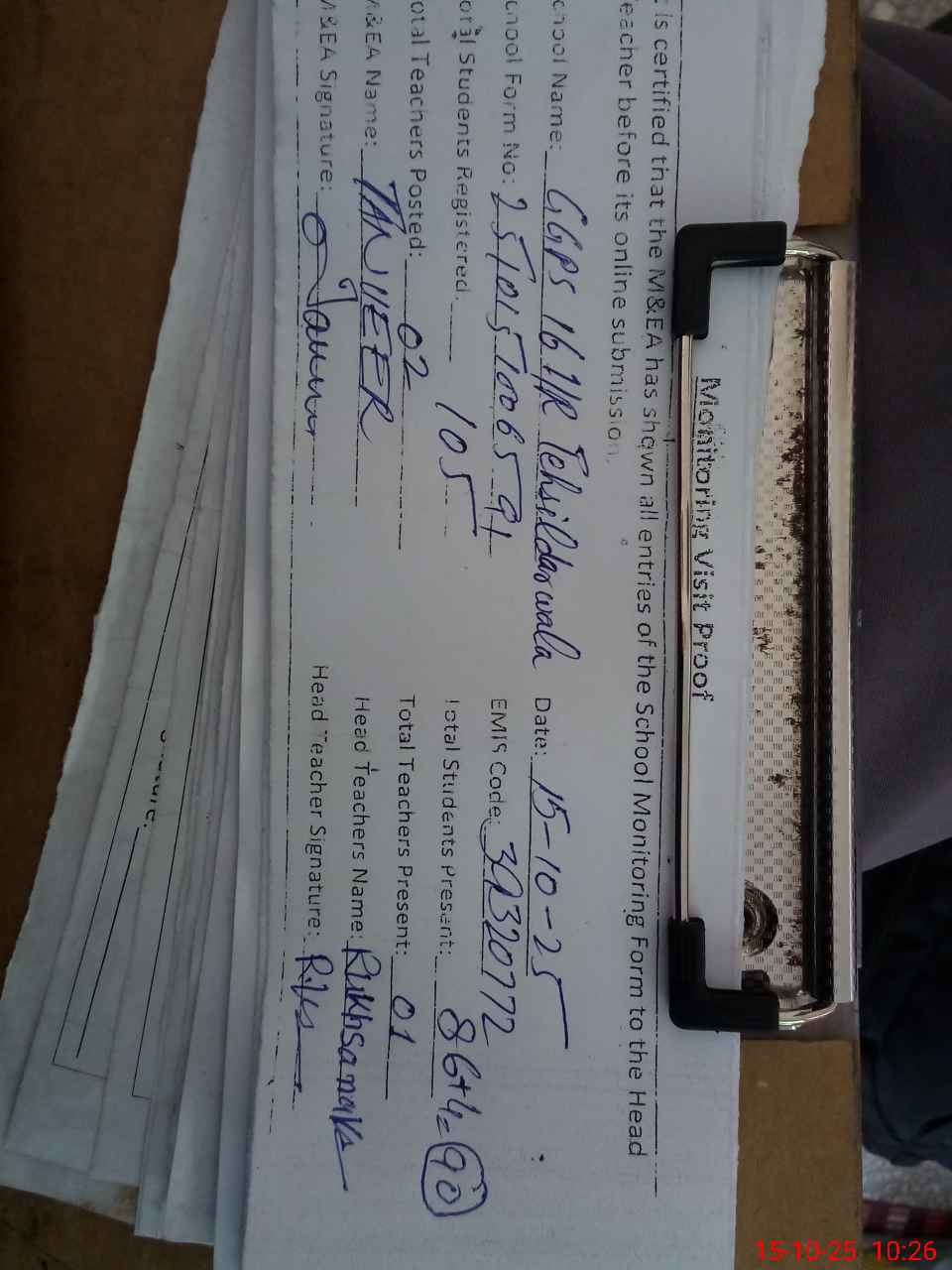 | Attendance Register | Head Teacher | MEA with School | Visit Proof |