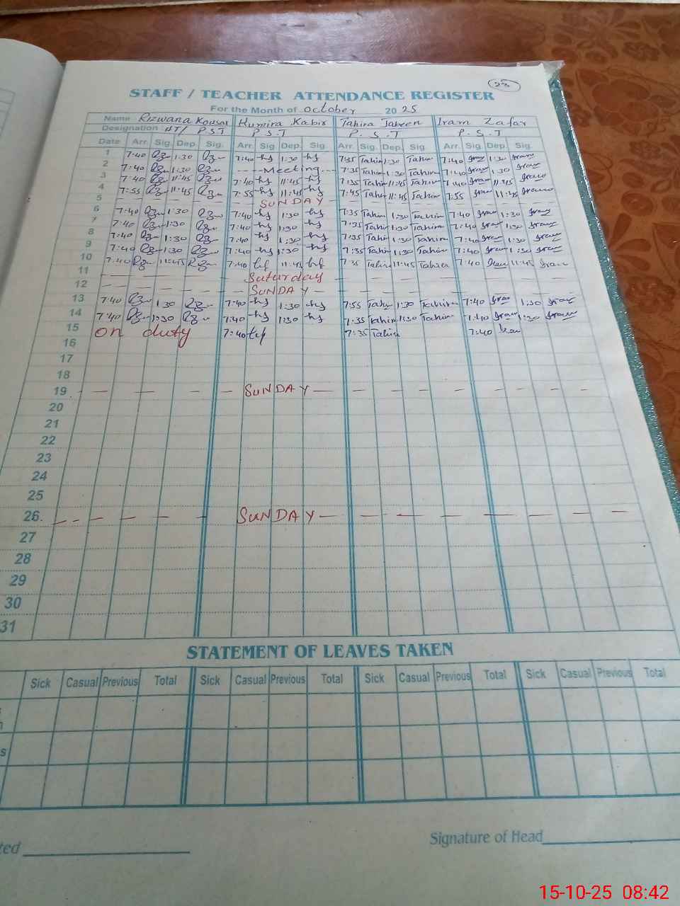 | Leave | Duty | Absent | Maternity | Medical | Ex- Pak |