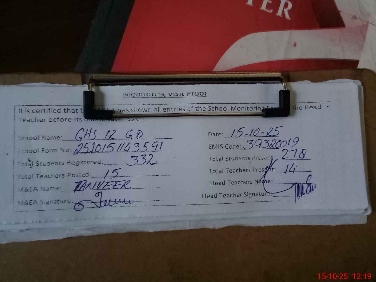 | Attendance Register | Head Teacher | MEA with School | Visit Proof |