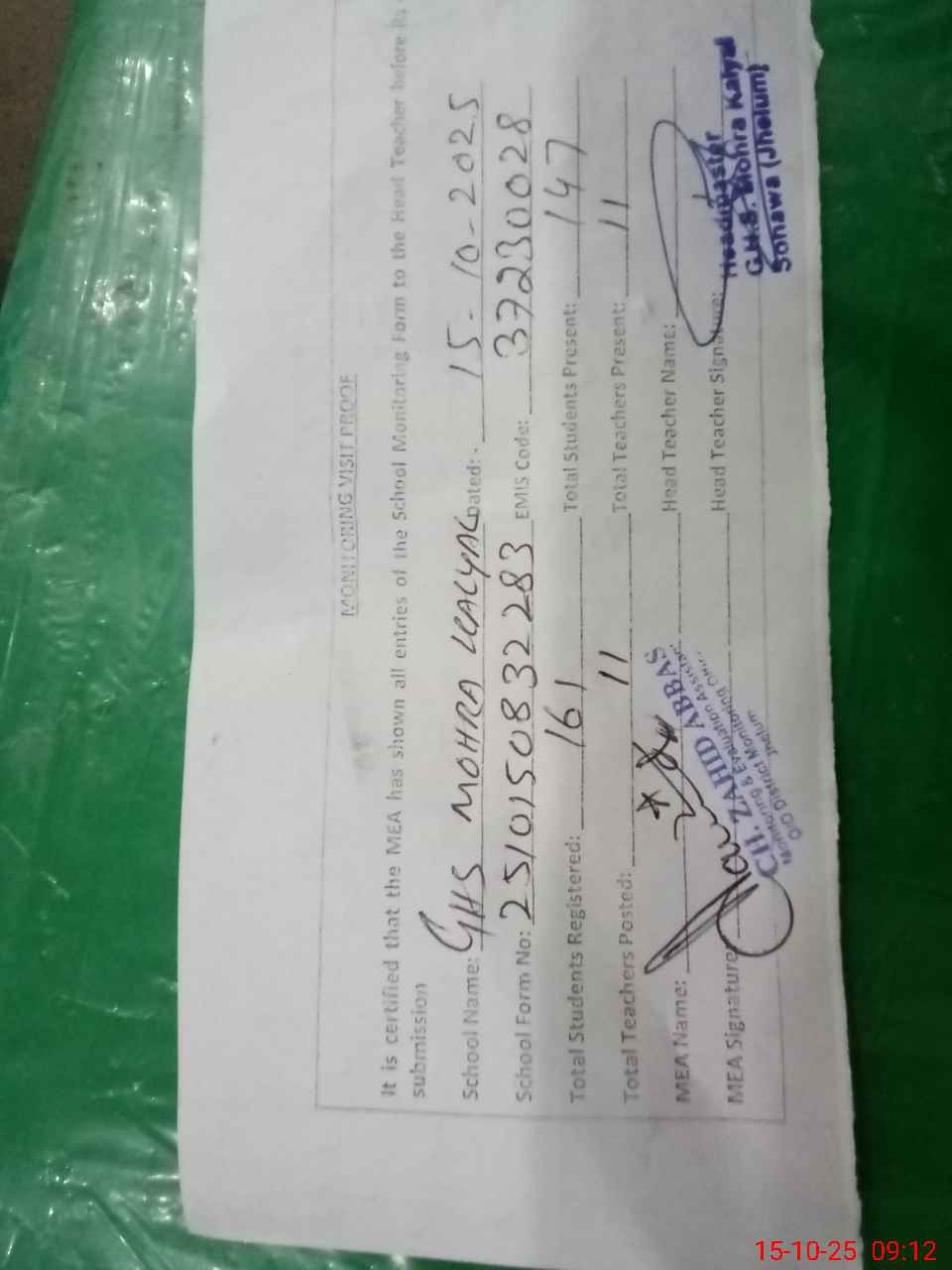 | Attendance Register | Head Teacher | MEA with School | Visit Proof |