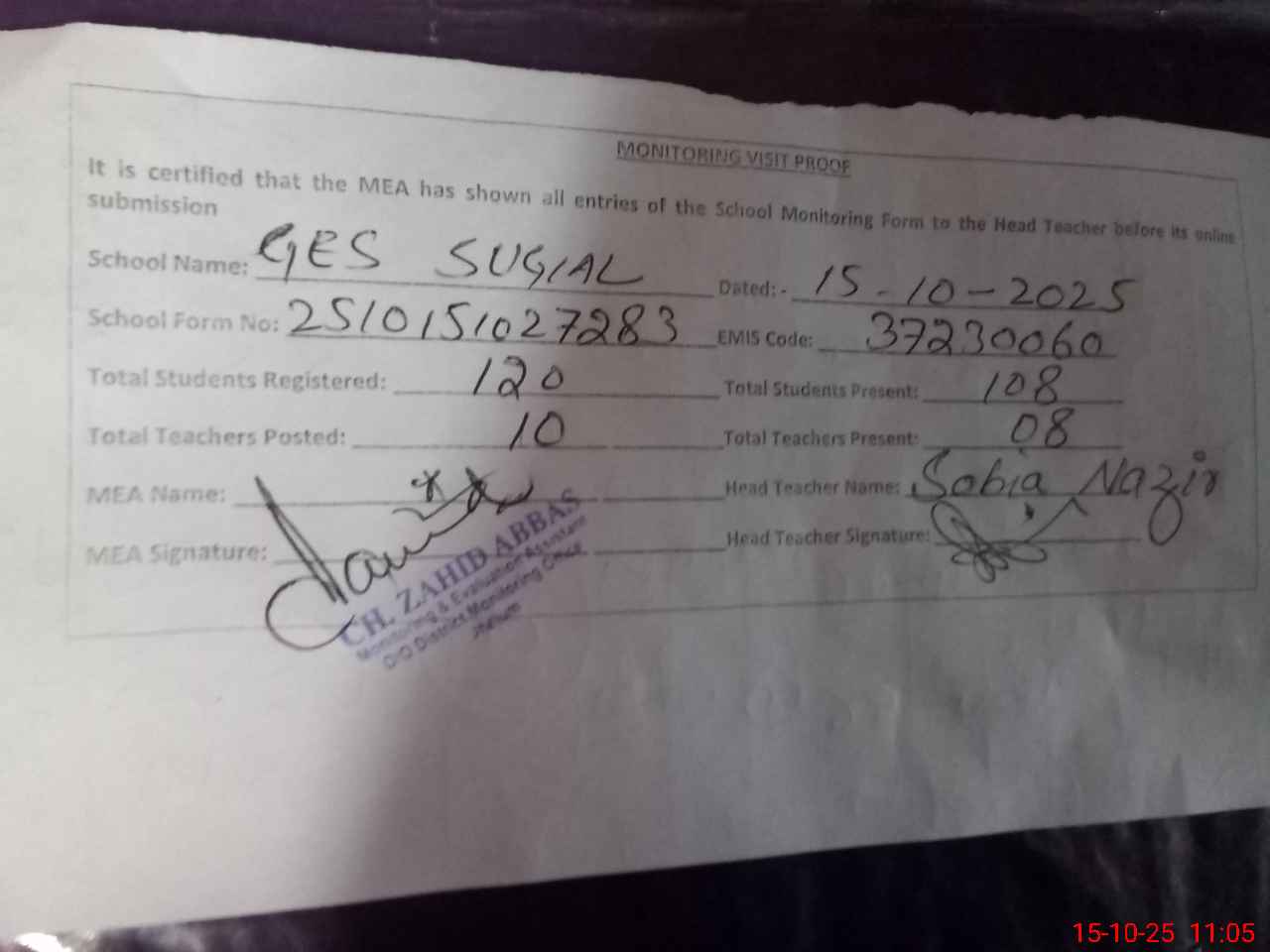 | Monitoring Date: 15-10-2025 | Start Time: 15-10-2025 10:27 AM | End Time: 15-10-2025 11:07 AM | Name of MEA: Za**** Ab**** | |