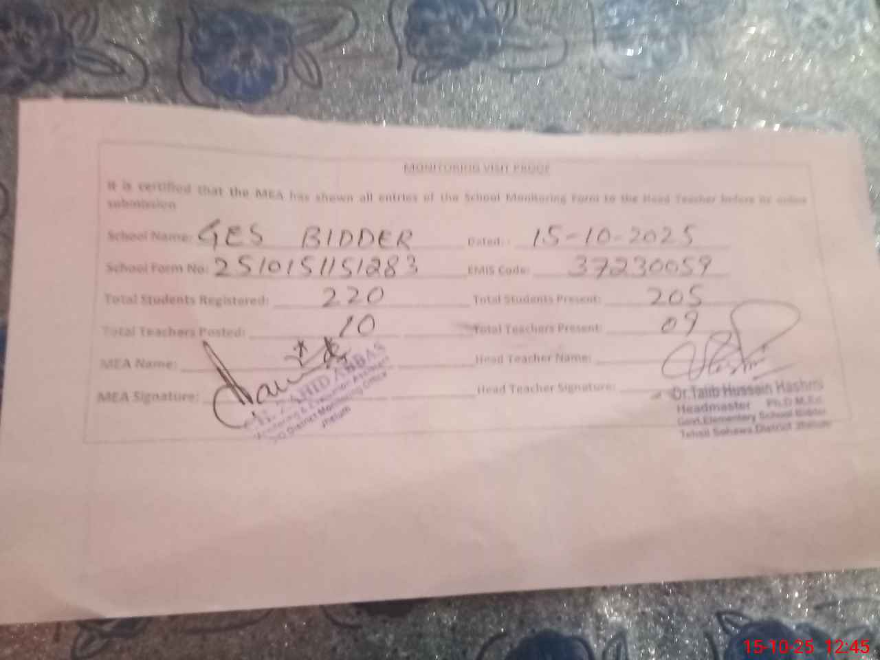 | Monitoring Date: 15-10-2025 | Start Time: 15-10-2025 11:51 AM | End Time: 15-10-2025 12:47 PM | Name of MEA: Za**** Ab**** | |