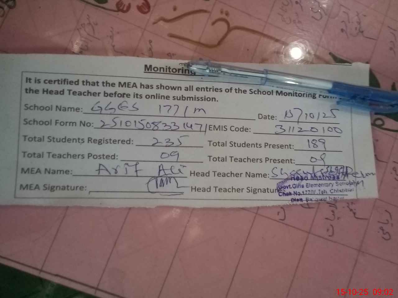 | Attendance Register | Head Teacher | MEA with School | Visit Proof |