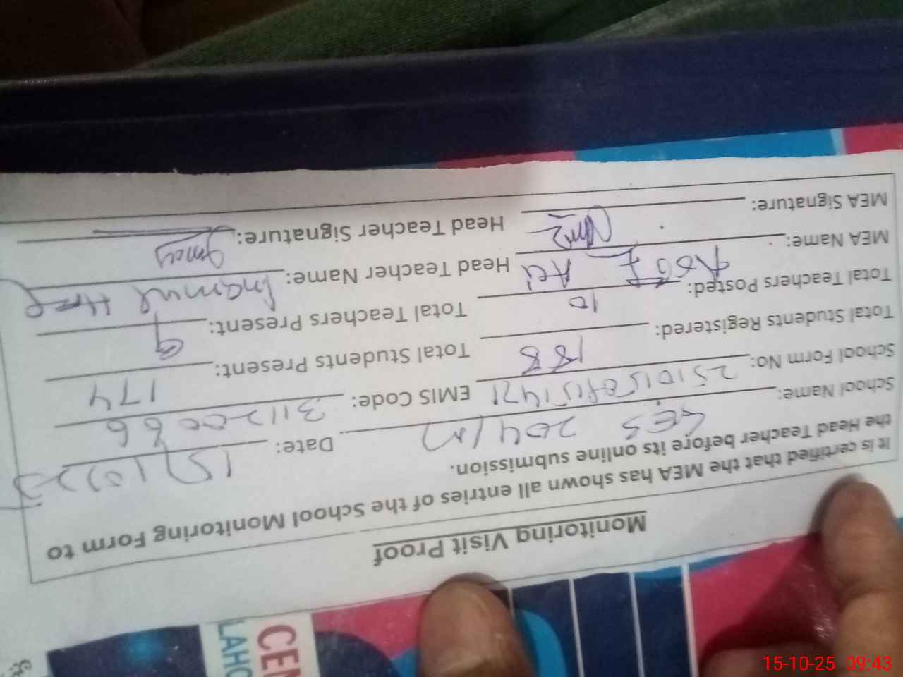 | Name: In**** ULHa**** Ta**** Designation: (School Headmaster's/Headmistress's) Sst Phone/Cell Number: 03**** |