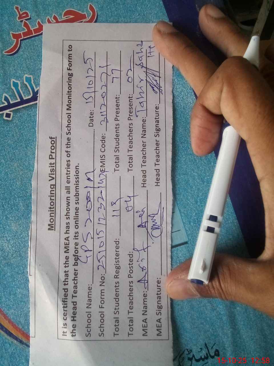 | Attendance Register | Head Teacher | MEA with School | Visit Proof |