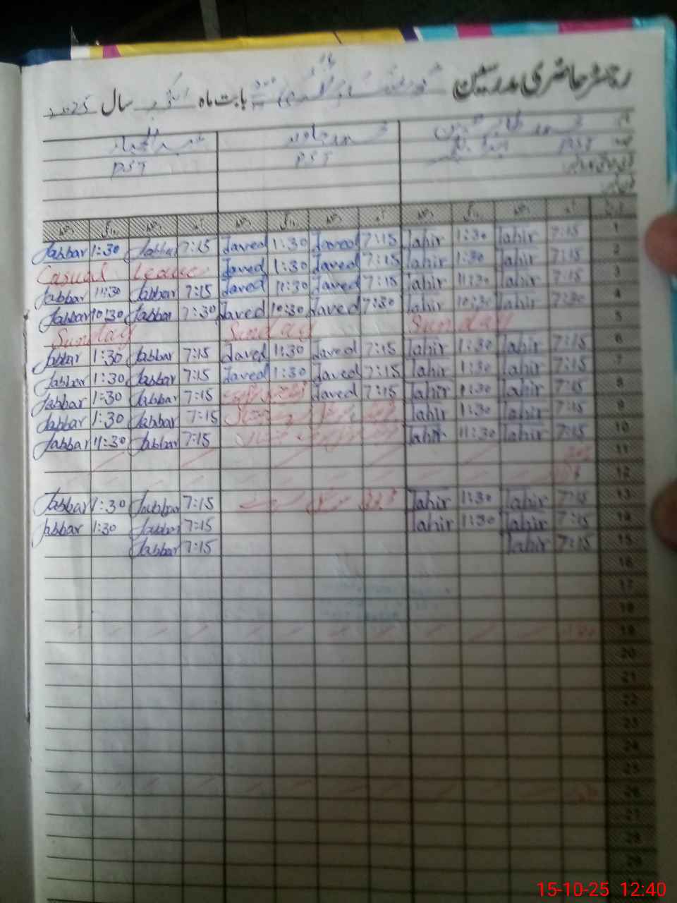 | CNIC | Full Name | Designation | R/C | Absence During Last Calender Month |