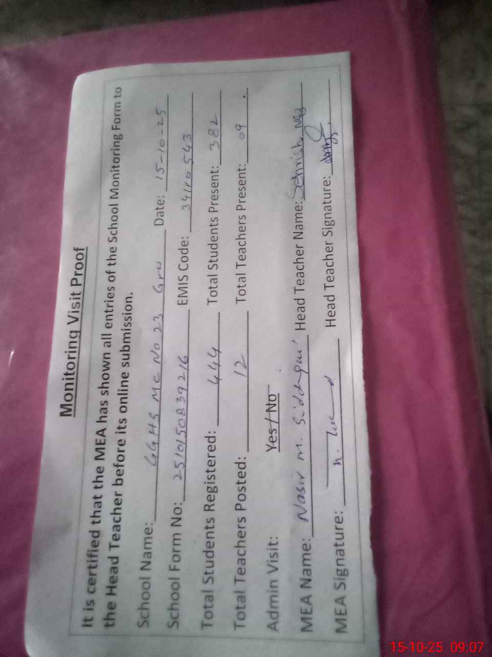 | Certified that this School was Inspected by the Undersigned MEA/DMO Today and the Information Stated Above is as Per Record. | |||||