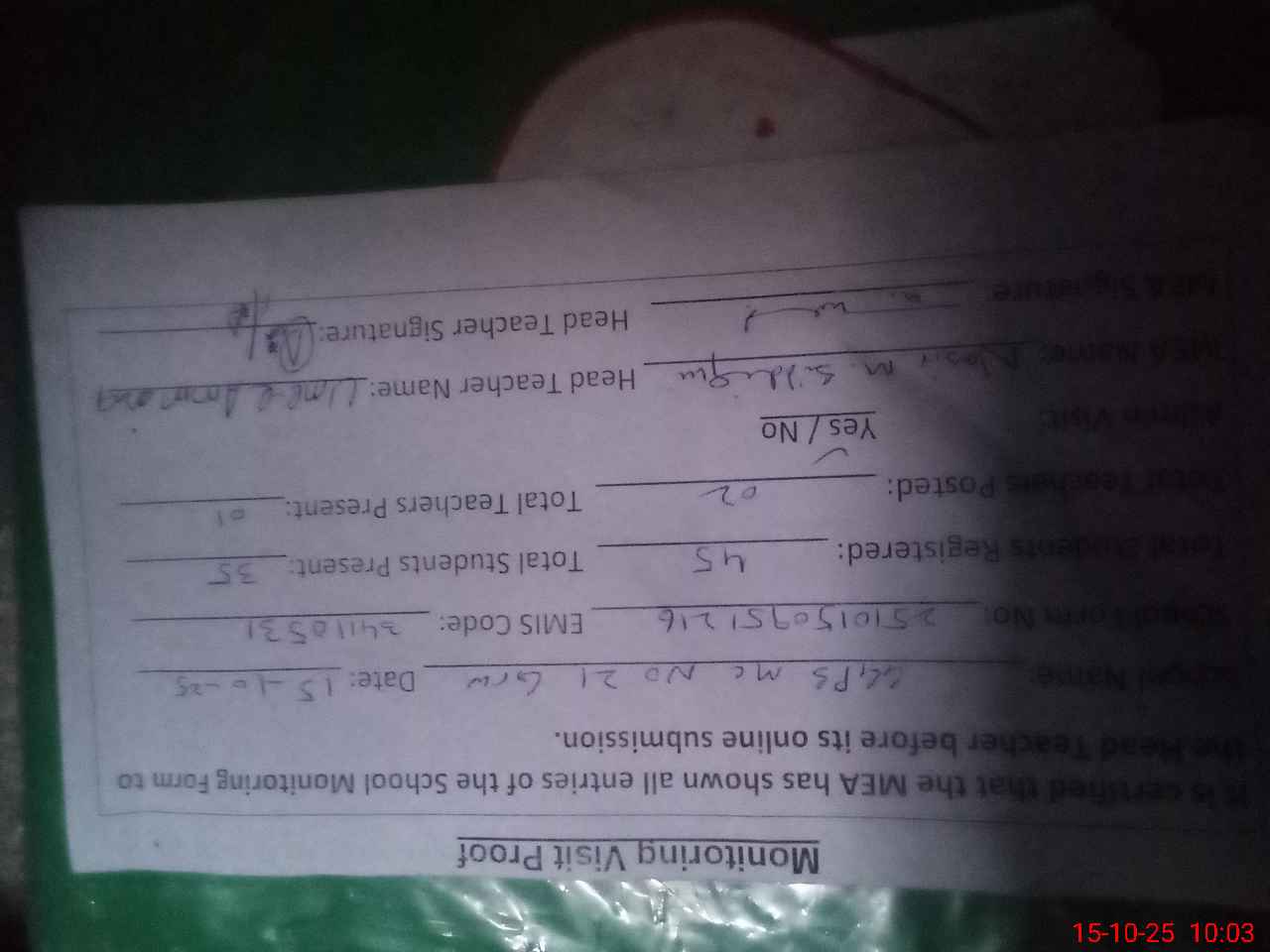 | Attendance Register | Head Teacher | MEA with School | Visit Proof |