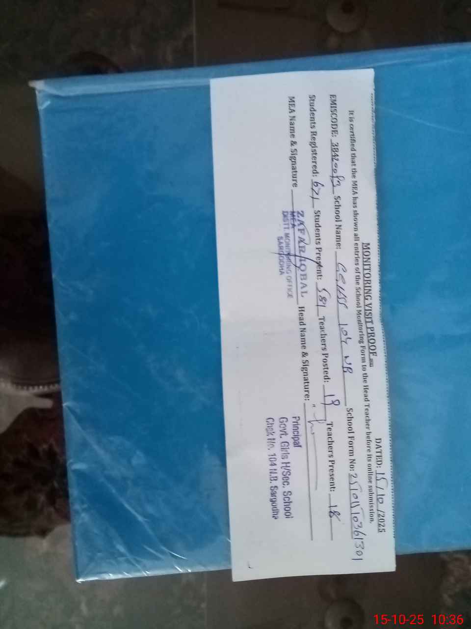 | Name: FE**** SH**** Designation: (School Headmaster's/Headmistress's) I/C Principal Phone/Cell Number: 03**** |