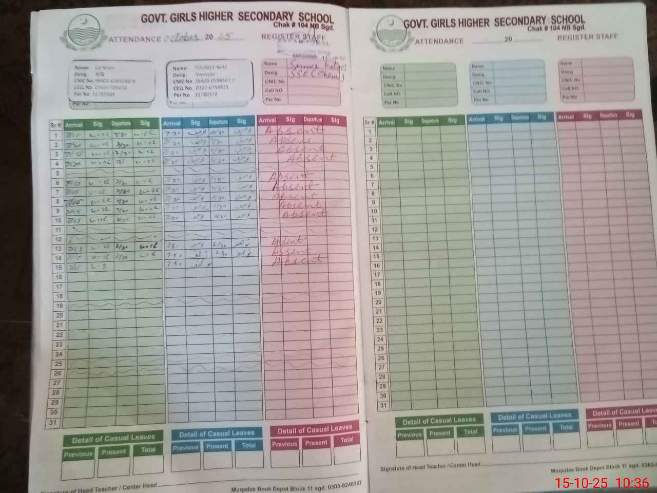 | CNIC | Full Name | Designation | R/C | Absence During Last Calender Month |