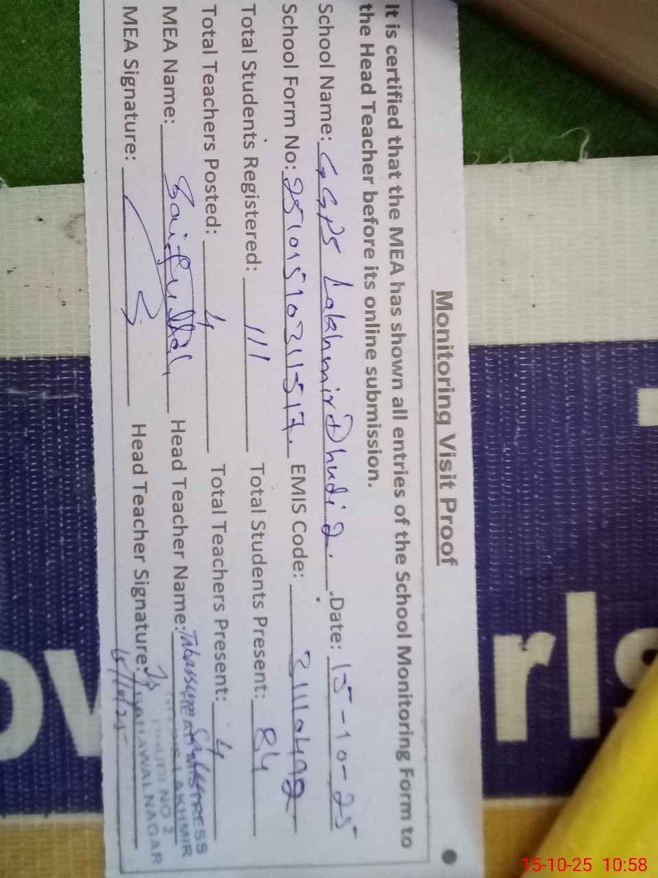 | EMIS Code: 31110492 | Name of School: GGPS LAKHMIR DHUDI NO 2 | |||