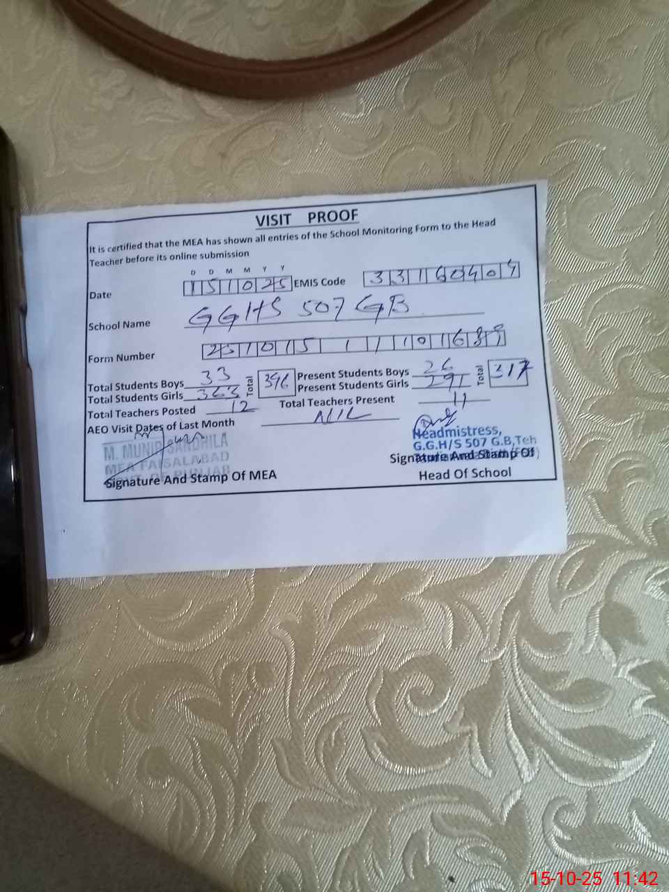 | EMIS Code: 33160404 | Name of School: GGHS CHAK NO. 507 GB | |||