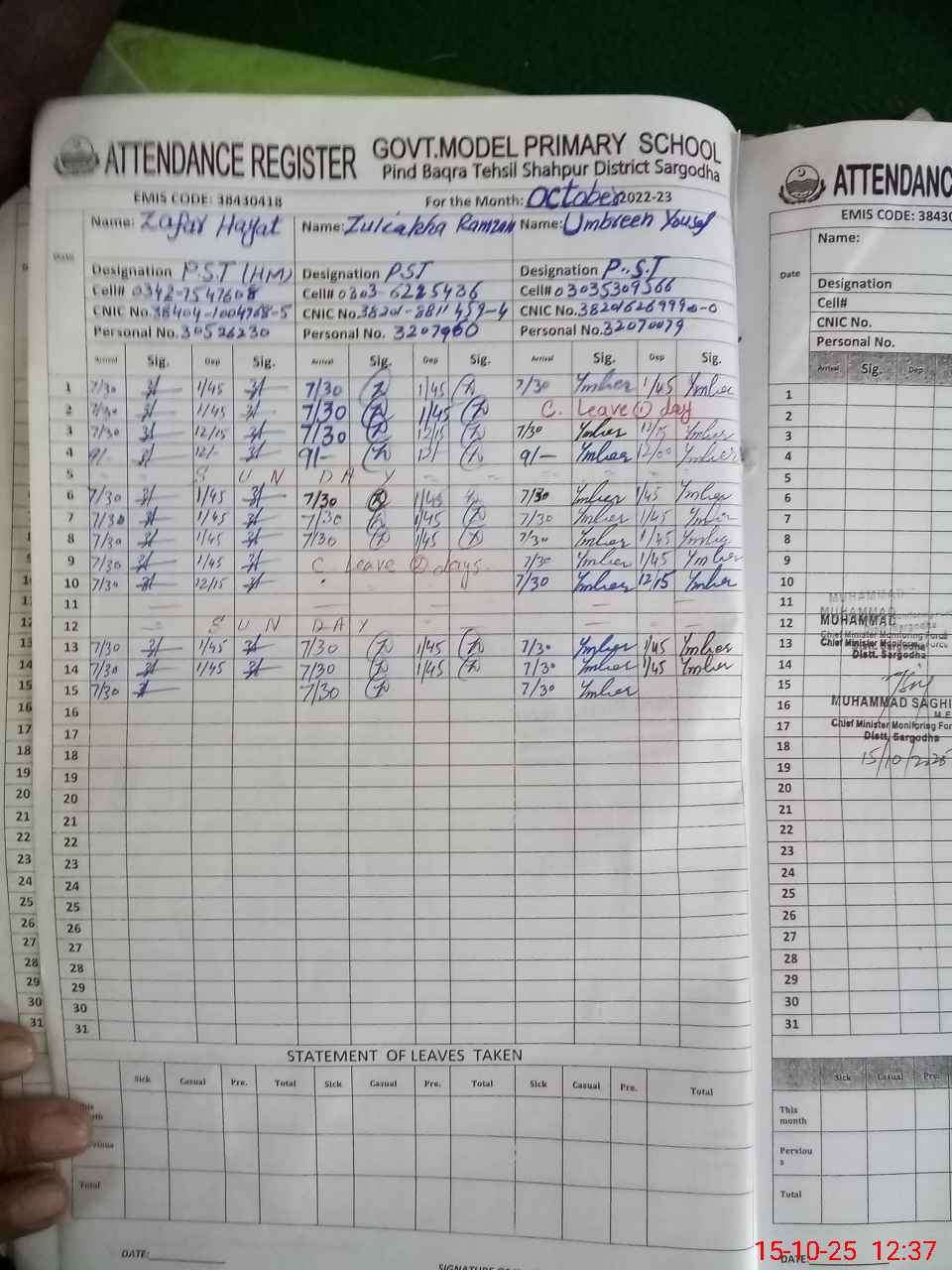 | Name: ZA**** HA**** Designation: (School Headmaster's/Headmistress's) PST Phone/Cell Number: 03**** |