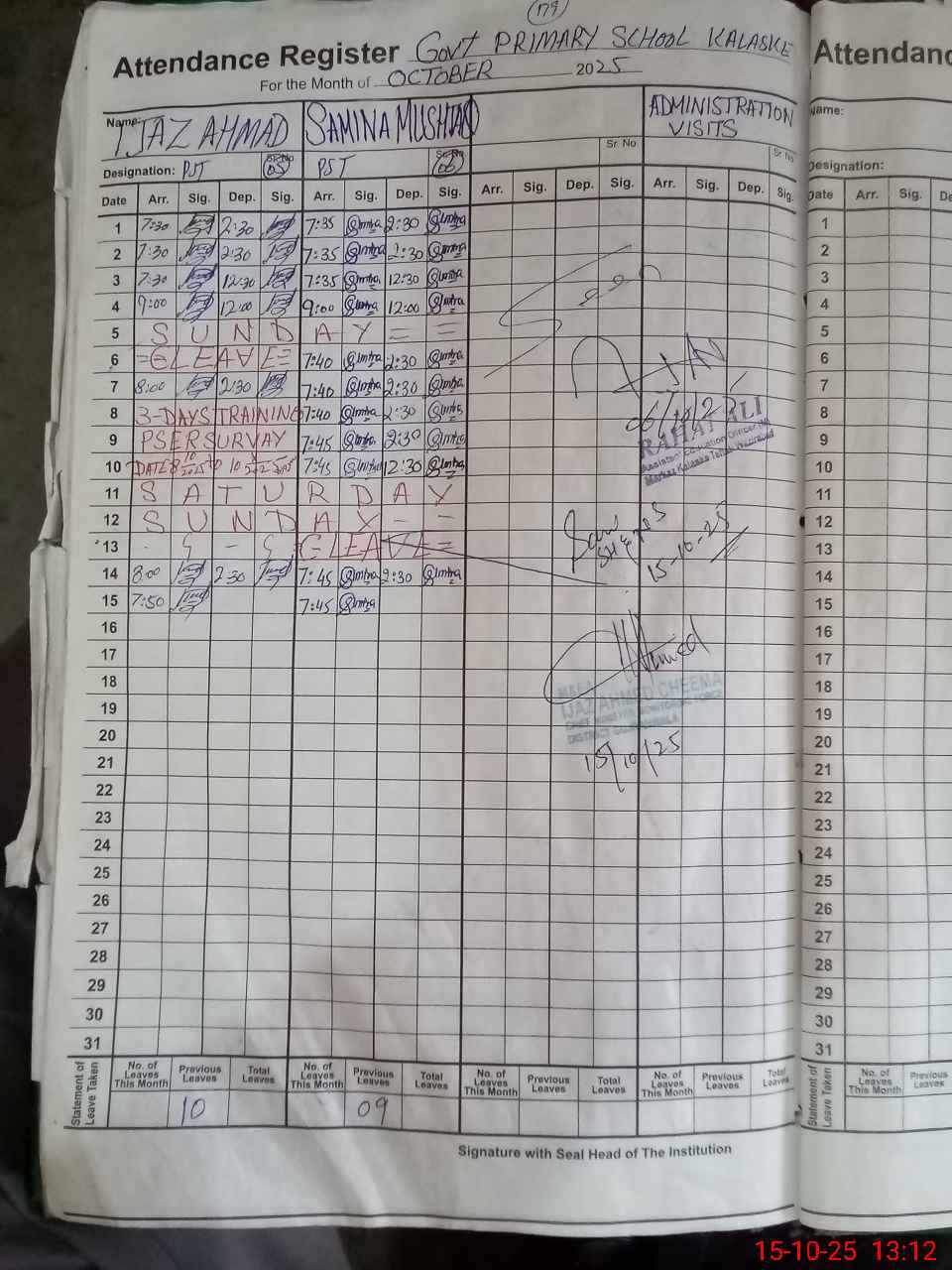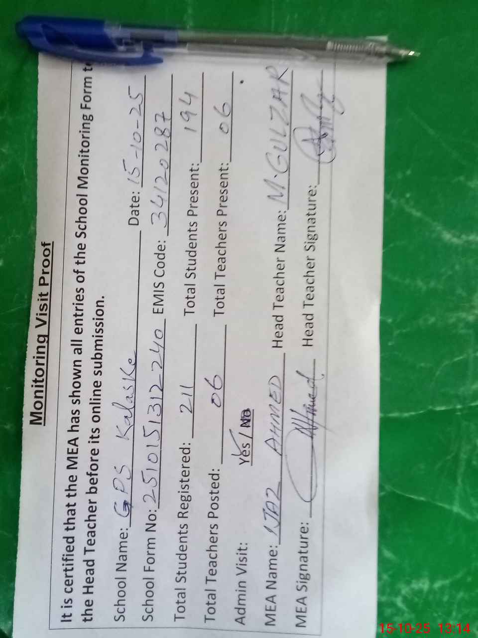 | Attendance Register | Head Teacher | MEA with School | Visit Proof |