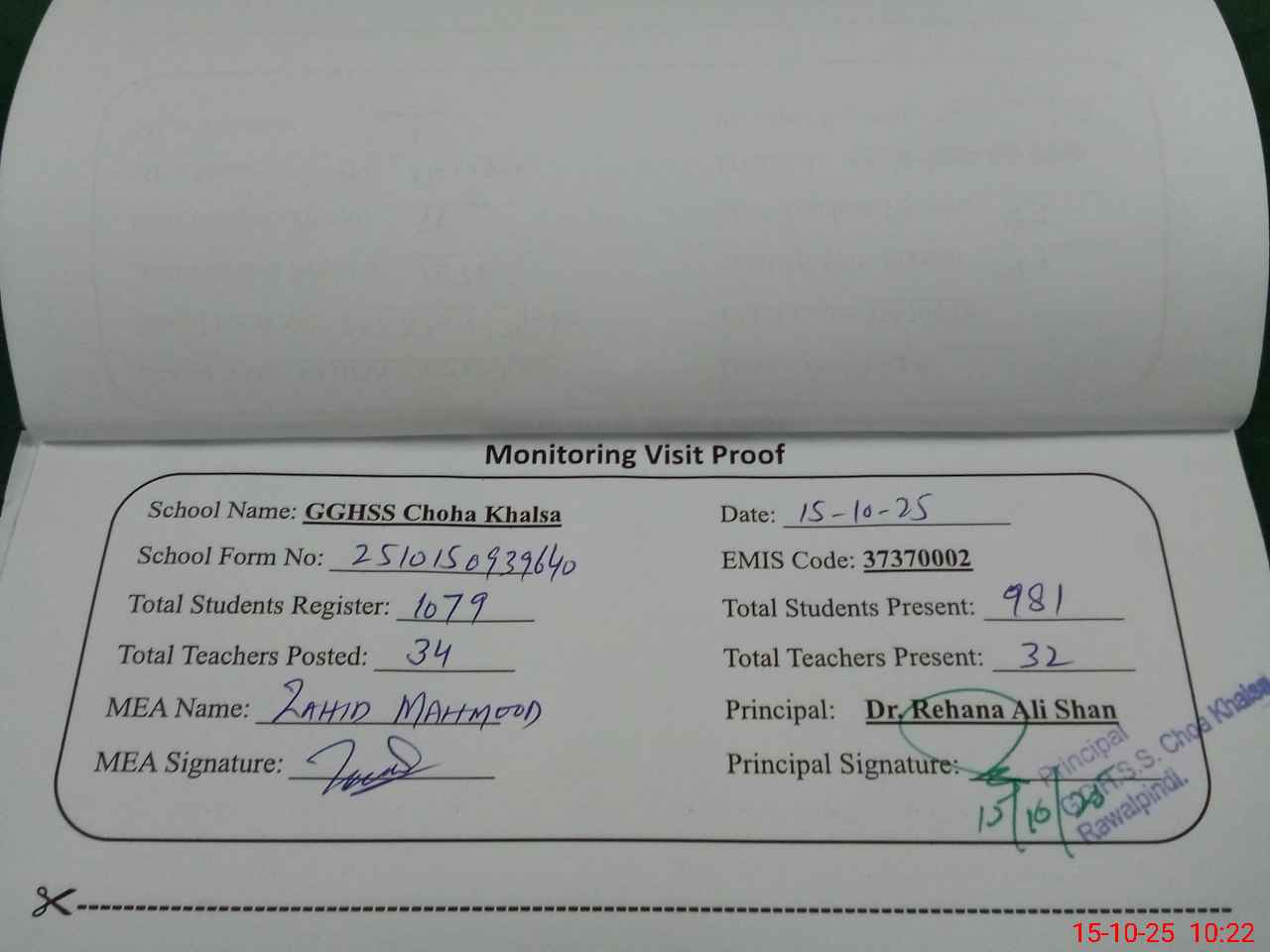 | Certified that this School was Inspected by the Undersigned MEA/DMO Today and the Information Stated Above is as Per Record. | |||||