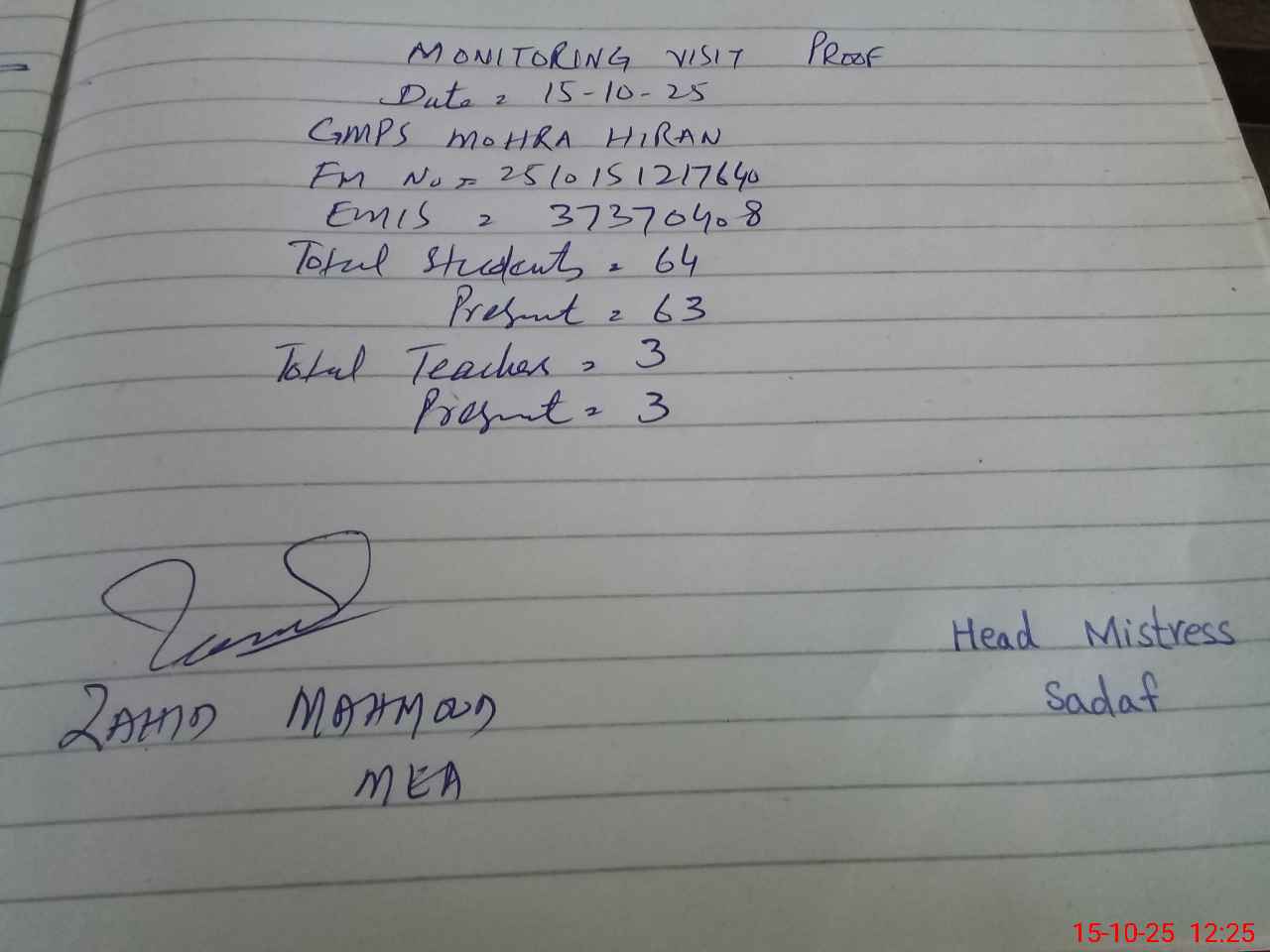 | Attendance Register | Head Teacher | MEA with School | Visit Proof |