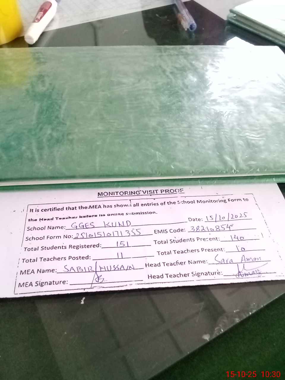 | Attendance Register | Head Teacher | MEA with School | Visit Proof |