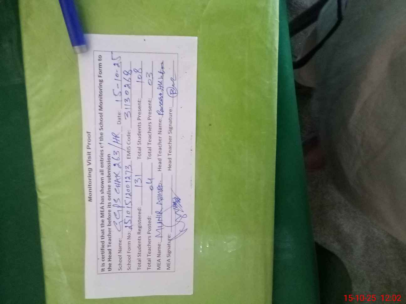 | Attendance Register | Head Teacher | MEA with School | Visit Proof |