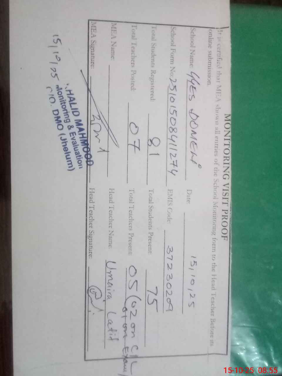 | Certified that this School was Inspected by the Undersigned MEA/DMO Today and the Information Stated Above is as Per Record. | |||||