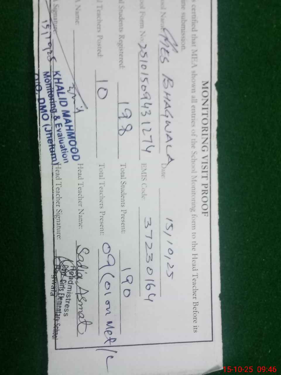 | Certified that this School was Inspected by the Undersigned MEA/DMO Today and the Information Stated Above is as Per Record. | |||||