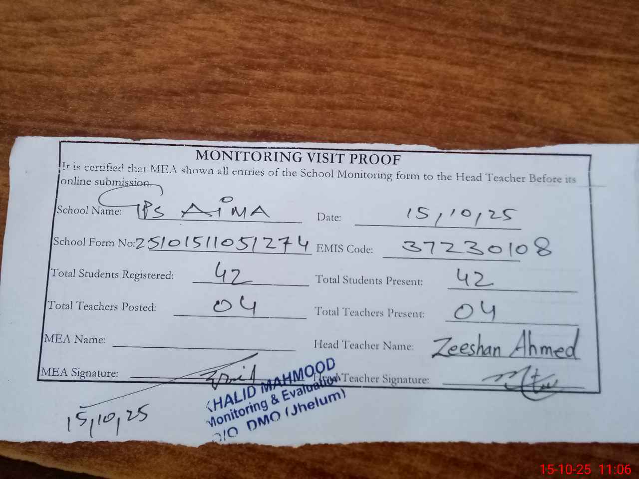 | Attendance Register | Head Teacher | MEA with School | Visit Proof |