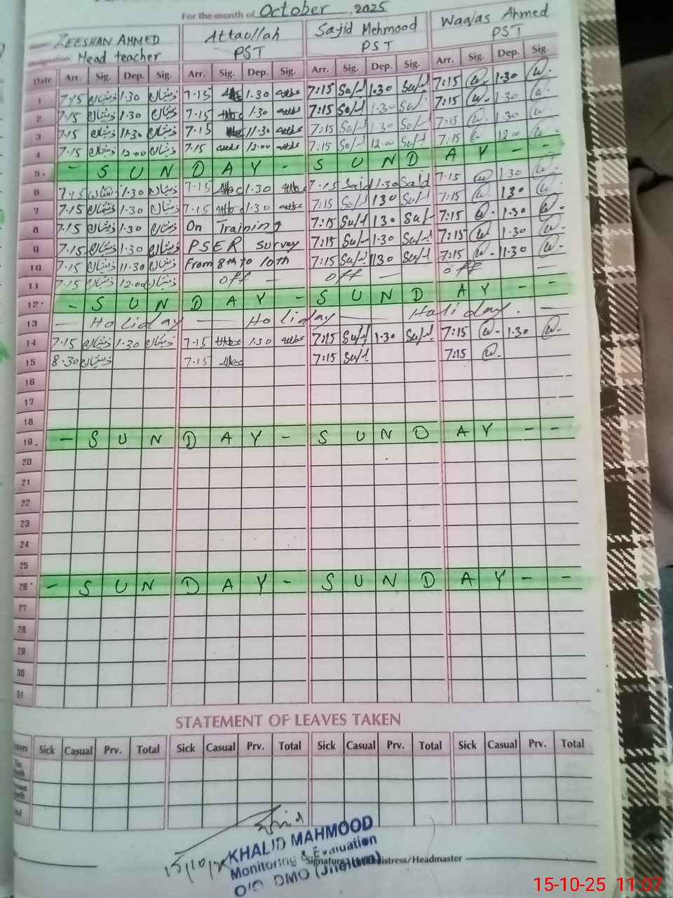 | Monitoring Date: 15-10-2025 | Start Time: 15-10-2025 10:49 AM | End Time: 15-10-2025 11:36 AM | Name of MEA: KH**** ME**** | |