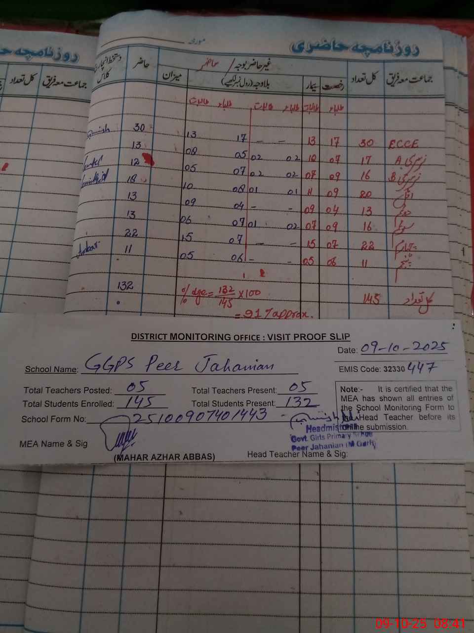 | Attendance Register | Head Teacher | MEA with School | Visit Proof |