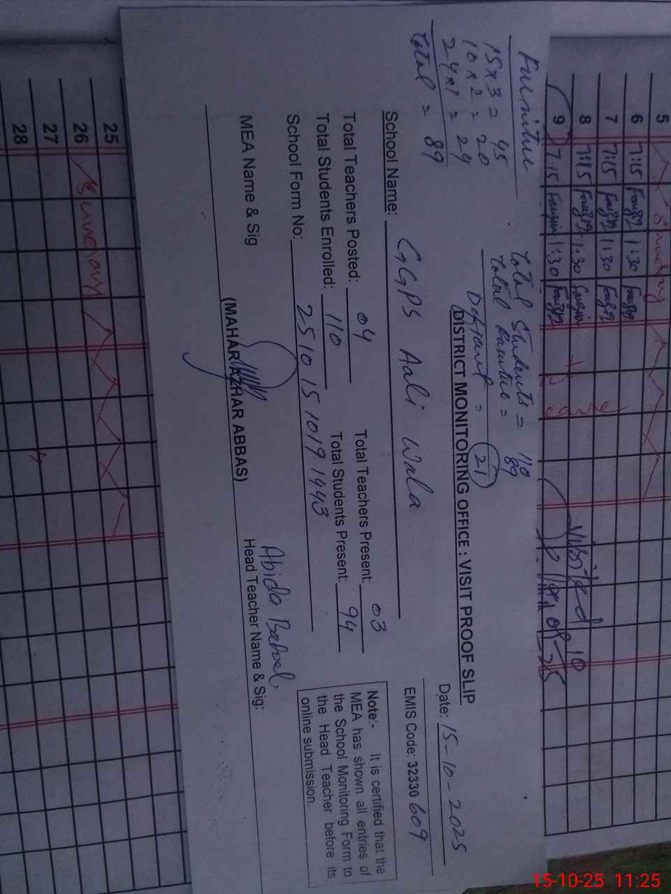 | Attendance Register | Head Teacher | MEA with School | Visit Proof |