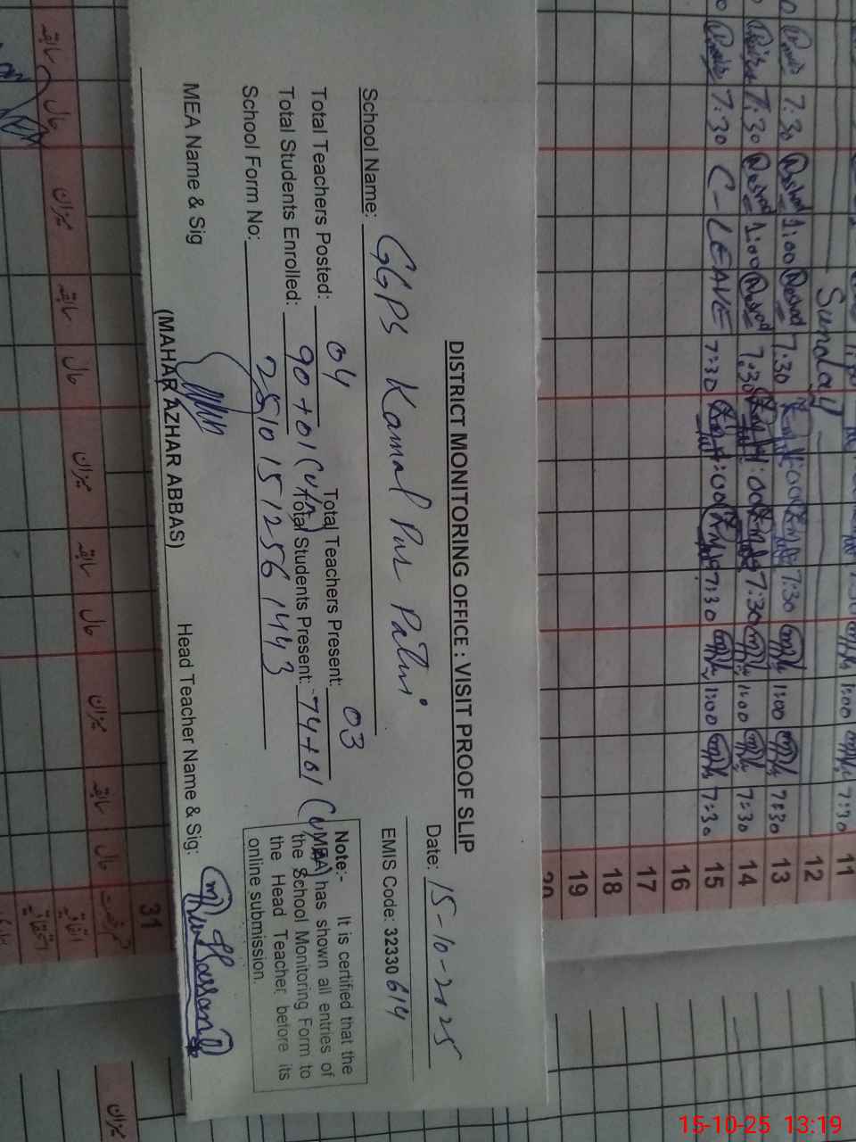 | Attendance Register | Head Teacher | MEA with School | Visit Proof |